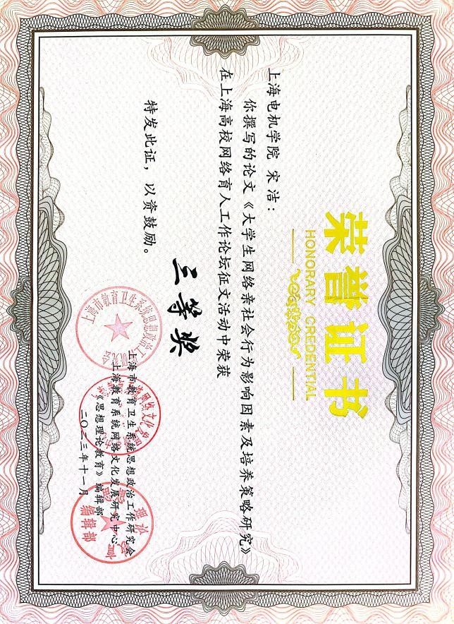 近日,我院宋洁老师在上海高校网络育人工作论坛征文中,以题为《大学生网络亲社会行为影响因素及培养策略研究》一文,喜获三等奖!