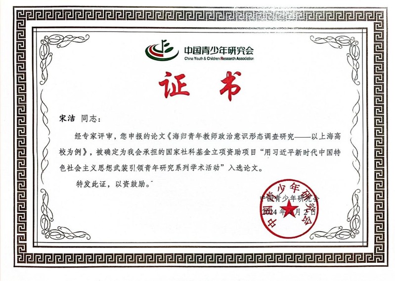 近日,中国青少年研究会公布了“用习近平新时代中国特色社会主义思想武装引领青年”研究入选成果,我院宋洁老师申报的论文《海归青年教师政治意识形态调查研究——以上海高校为例》成功入选。