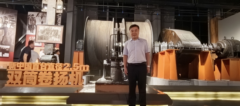 (刘炳辉在焦裕禄书记主持研制的我国首台2.5米双筒卷扬机前留念)